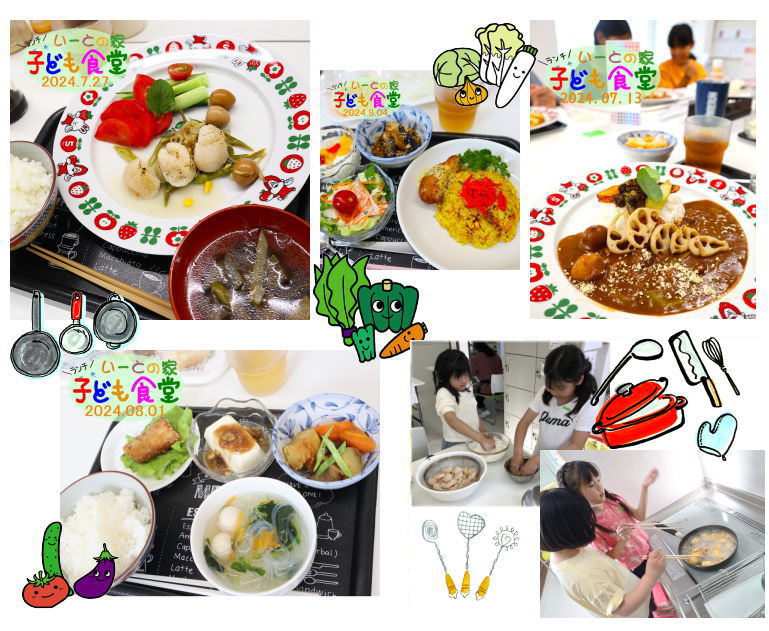 こども食堂では、子どもたち自身も調理や食器洗いに参加します。 ただ「食べる」だけでなく、みんなで作って、みんなで片づける—— そんな時間も楽しい学びのひとつです。 また、SDGs活動としてフードロス食品を活用したメニューになっています。 寄付でいただいた食材を活かしたメニューで、おいしく、やさしく、地球にもやさしい食堂です。