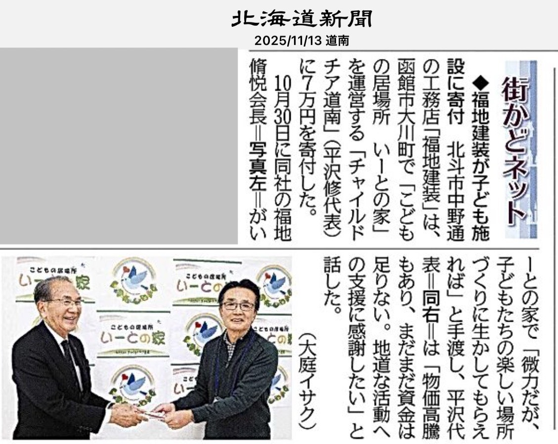 北海道新聞:街かどネット「福地建装が子ども施設に寄付」